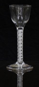 An 18thC clear drinking glass with opaque double twist stem and ogee shaped bowl raised on conical foot, 15.5cm tall.