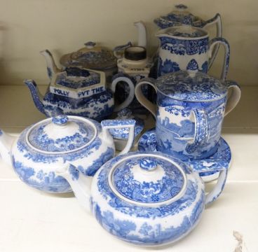 Spode Italian pattern collection of teapots, unusual tea caddy, teapot stand and three handled lidded tea caddy with Old Lang Syne print to inner rim etc