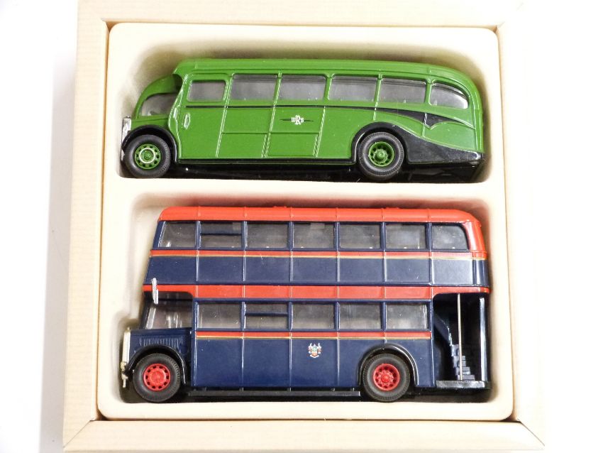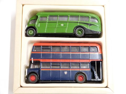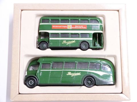 Four Corgi diecast model bus sets comprising East Lancashire Guy Aran and Leyland Tiger 97077, Provincial Set Gosport and Fareham 97072, Coventry AEC Bus and Bedford OB Coach 97061 and Grey-Green AEC Regal 97180, all in original boxes