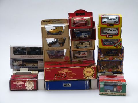 Twenty-seven Matchbox, Burago, Lledo and other diecast model vehicles and vehicle sets including YS-16 Scammell 100 Ton Truck-Trailer with GER Class E 4-2-4 locomotive, Models of Yesteryear, Prince William etc., all in original boxes