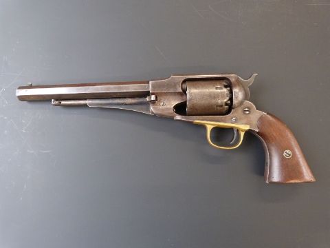 Remington 1858 New Model Army .44 single action six shot American Civil War revolver with brass trigger guard, shaped wooden grips impressed 'B.H.' and 8 inch part octagonal barrel stamped "Patented Sept 14 1858 E Remington & Sons Ilion. New York USA New - Model", overall length 37cm.