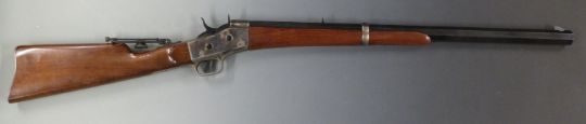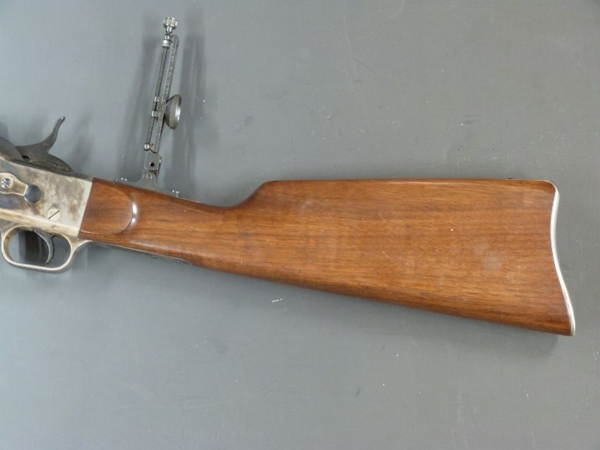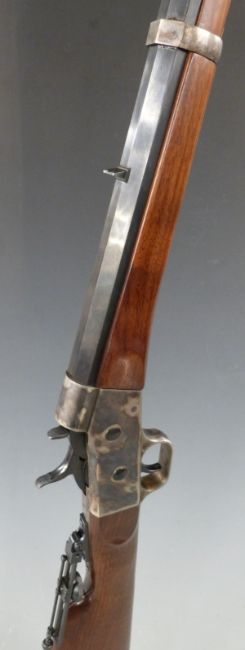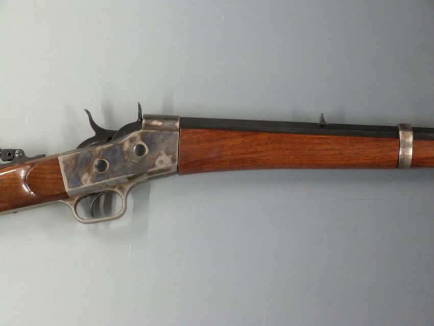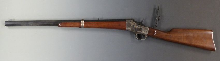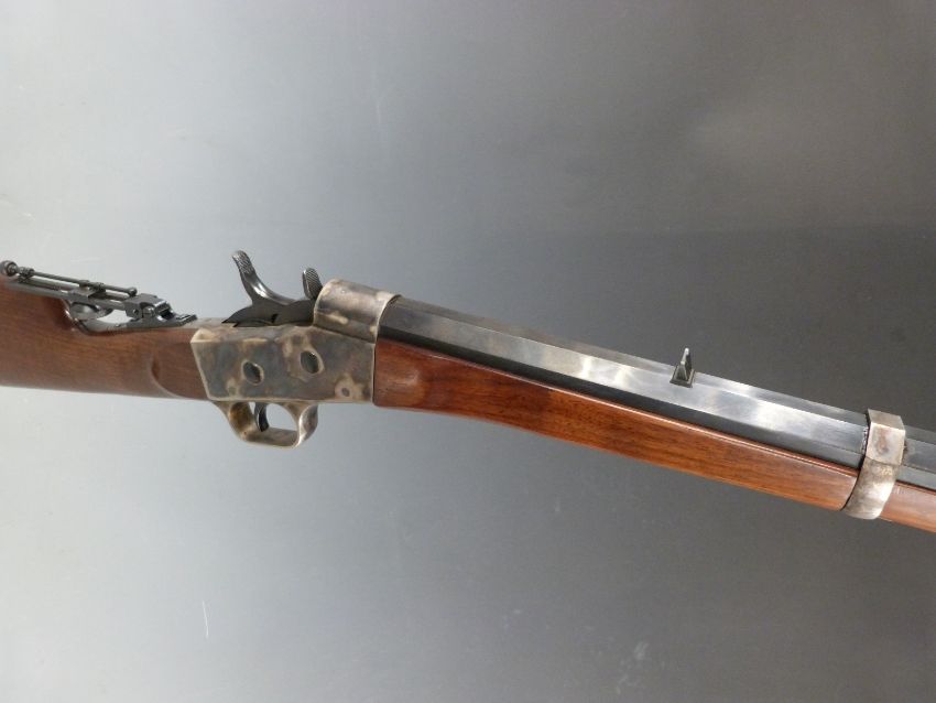 Pedersoli Sharps Creedmore Remington style .45-70 rolling block target rifle with folding long range target peep sight, steel mounts and heavy 25 inch octagonal barrel, overall length 16.5cm, serial number RO11062. PLEASE NOTE THAT A VALID RELEVANT FIREARMS/SHOTGUN CERTIFICATE IS REQUIRED TO HANDLE/PURCHASE THIS ITEM.