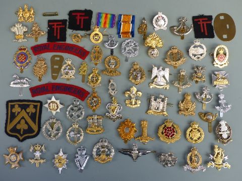 A collection of British Army cap badges, bi-metal / staybrite, including Scots Dragoon Guards, Royal Artillery, 9th/12th Lancers etc together with WWI cloth insignia etc