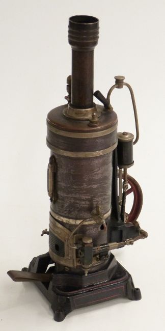 Bing of Nuremburg Germany stationary vertical live steam with single cylinder slide valve engine, water gauge, feed pump and whistle, 33cm tall.