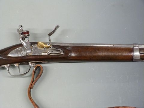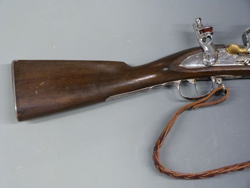 French flintlock three band hammer action musket with lock stamped 'M.'e imp.le De St etienne', brass pan, platted brown leather sling and polished steel lock, hammer, trigger guard, butt plate, mounts and 45 inch barrel, overall length 153cm.