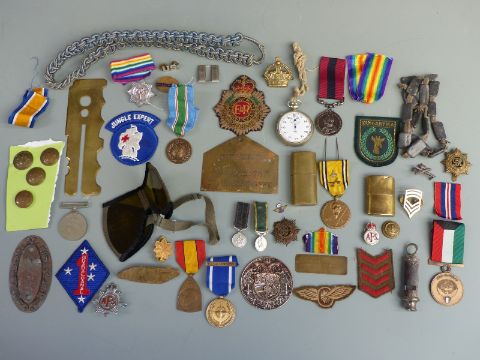 Quantity WWI and WWII medals, badges including hallmarked machine gun corps, trench art etc