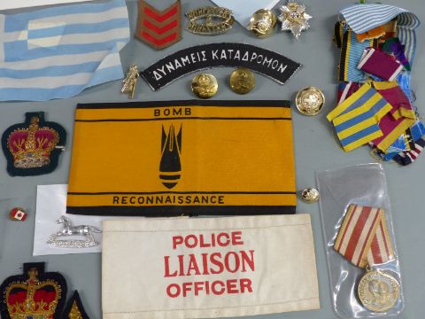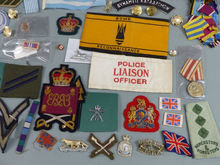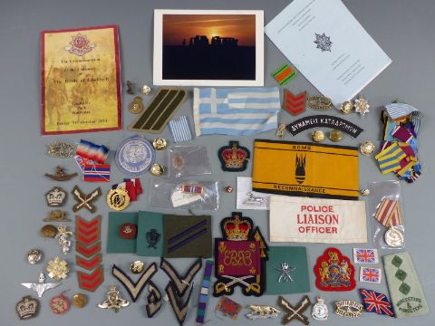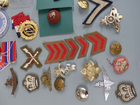 A collection of British Army badges and insignia to include Grenadier Guards Colour Sergeant rank badge, WOI rank badge etc