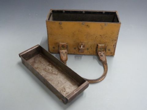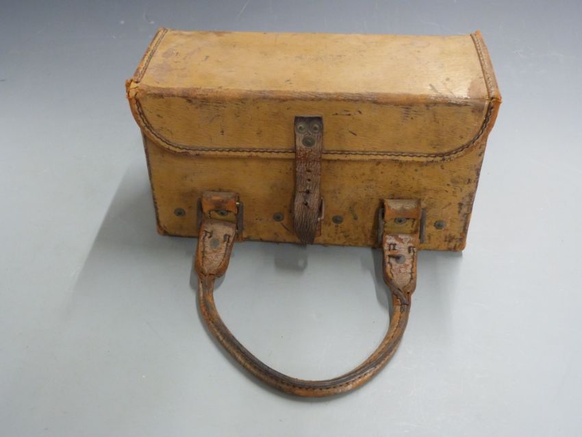 Military issue steel lined leather bound shotgun cartridge or ammunition carry case with removable tray and carry handles, marked to the top 'W D' either side of a ministry broad arrow, 33x14x20cm.