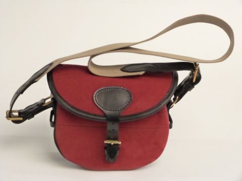 A matching suede and leather cartridge bag and gun slip, both with brass mounts and shoulder straps.