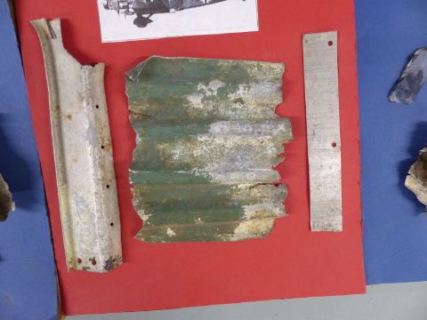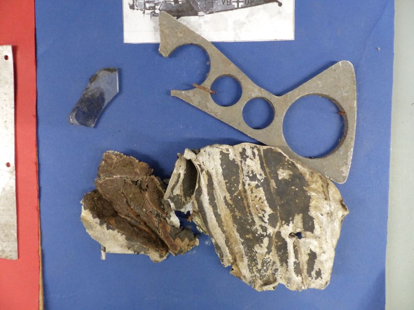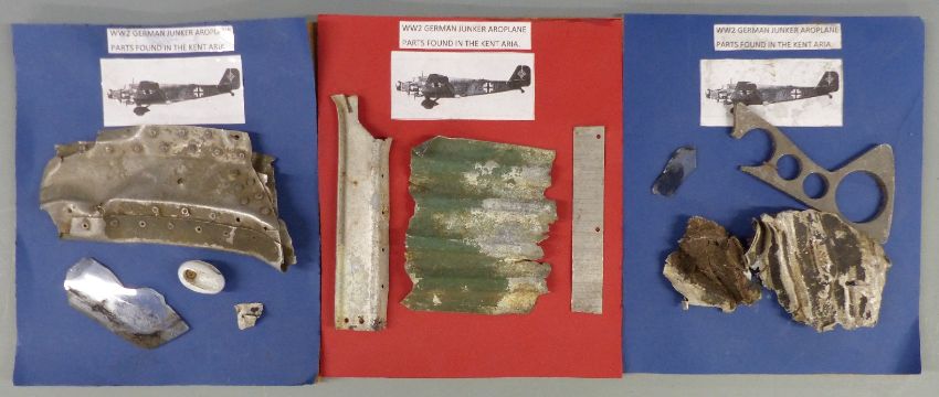 WWII wreckage parts of a German Junkers JU52 found in the Kent area, mounted on three boards