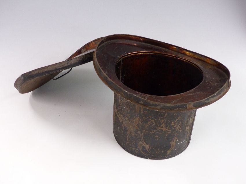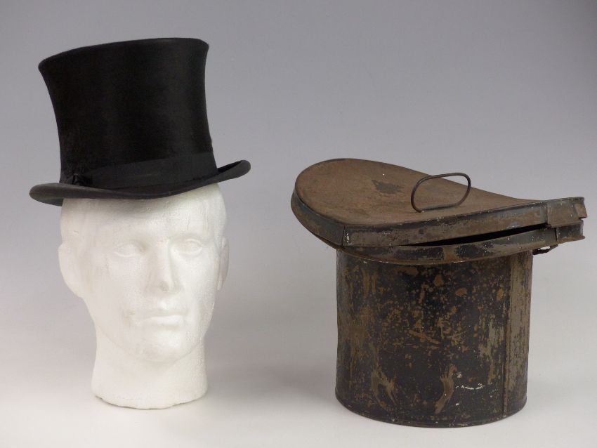 Silk top hat with letter as to where it was found, date 1886, size 6 7/8, in original tin case. Labelled inside CJ. Oliver & Sons, Gallow Tree Gate, Leicester