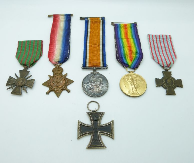 British Army WWI medals comprising 1914 Star, War Medal and Victory Medal named to SE 595 Pte. C.Seares A.V.C, Star named S.STH C.Seares (Shoeing Smith, Army Veterinary Corps) together with WWI French Croix du Guerre, Croix du Combatiant and a German Iron Cross