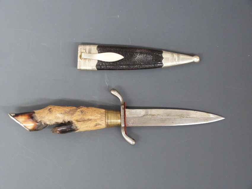 Hoof handle hunting knife, with sheath, marked with anchor & mirror finish to 10cm blade.