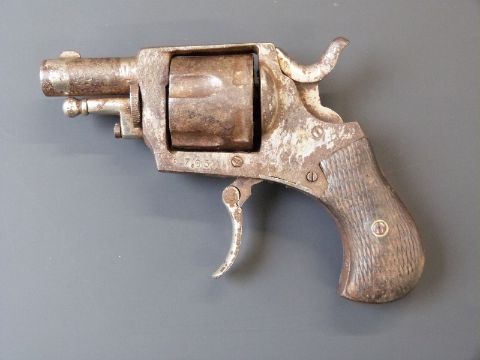 Roth-Saver 7.65mm five-shot double action centre fire revolver with chequered wooden grips, folding trigger and 1.75 inch barrel, overall length 14cm.