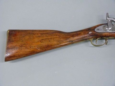 Enfield pattern three band percussion hammer action gun with lock stamped with crown and marked Enfield, brass trigger guard butt plate and mounts, brass tipped steel ram-rod, alignment sights, socket bayonet and 38 inch smooth bored barrel stamped 660, overall length excluding bayonet 137cm.
