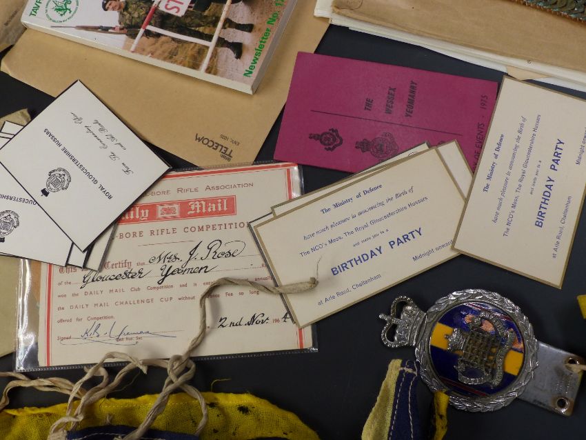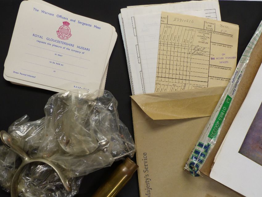 British Army, a collection of Royal Gloucestershire Hussars memorabilia including car badge, stable belts, busby plumes, photographs (Vienna Ride), Guidon presentation and Badminton etc, together with Royal Wessex Yeomanry memorabilia, documents etc
