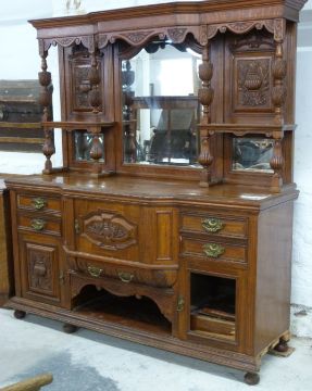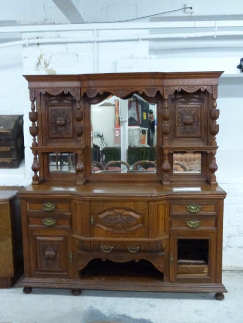 A late 19thC oak sideboard with bevelled edge mirror to back, carved columns and shelves, the base fitted drawers, cupboards and shelves, W184 x D57 x H200cm