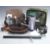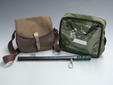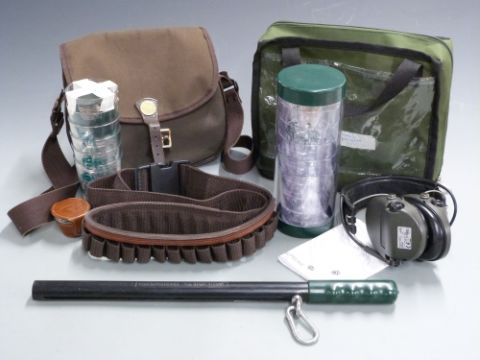 A collection of shooting related items comprising a cartridge bag, 20 bore shotgun cartridge belt, a pair of MSA Supreme ear defenders in canvas bag, a magnetic shotgun cartridge case collecting stick, two sets of stacking cups and a set of stainless steel stacking shot glasses.