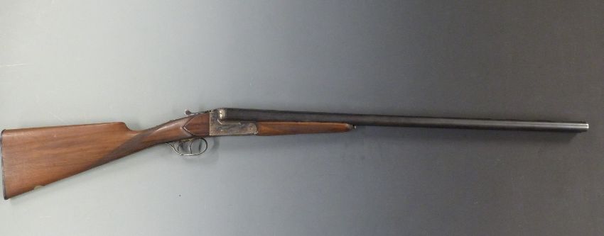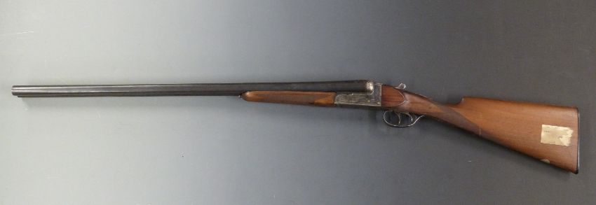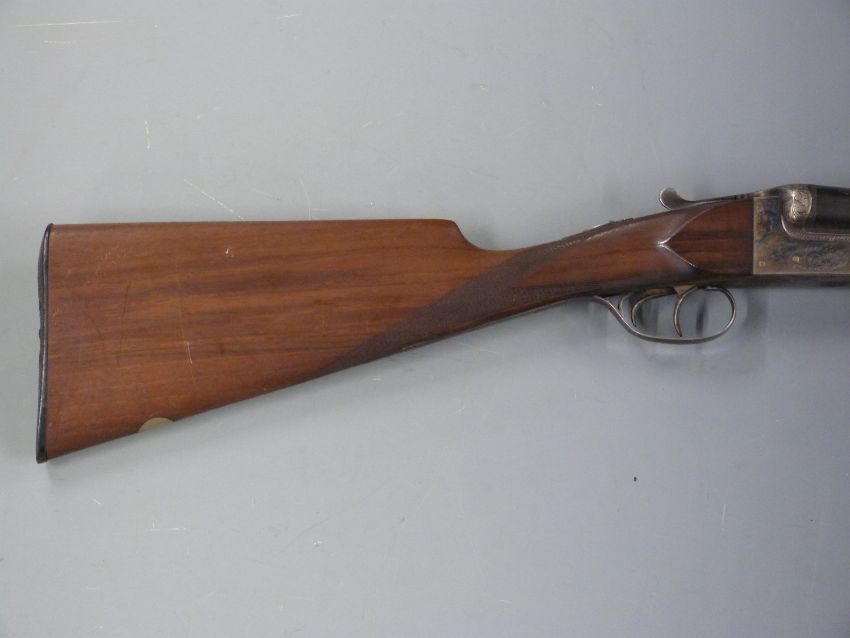 Elbar 12 bore side by side shotgun with engraved lock, chequered grip and forend and 27.75 inch barrels, serial number 21488. PLEASE NOTE THAT A VALID RELEVANT FIREARMS/SHOTGUN CERTIFICATE IS REQUIRED TO HANDLE/PURCHASE THIS ITEM.