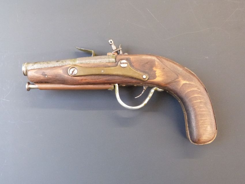 Flintlock hammer action pistol with brass mounts and 3.75 inch part octagonal barrel, overall length 21cm.