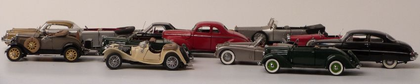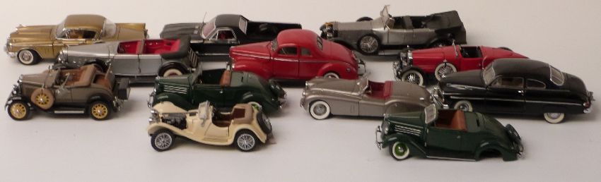 Twelve Franklin and Danbury Mint diecast model cars including Jaguar, Chevrolet, Ford, Studebaker etc