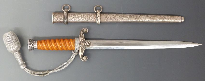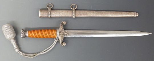 German WWII army officers dagger, F.W.Holler Solingen to 25cm blade, metal sheath and knot, oak leaf decoration to hilt, guard and sheath