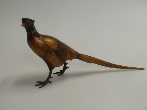 A cold painted bronze / metal figure of a pheasant,, in the manner of Bergmann. Impressed mark possibly Mangreb. H 17cm x L 35cm