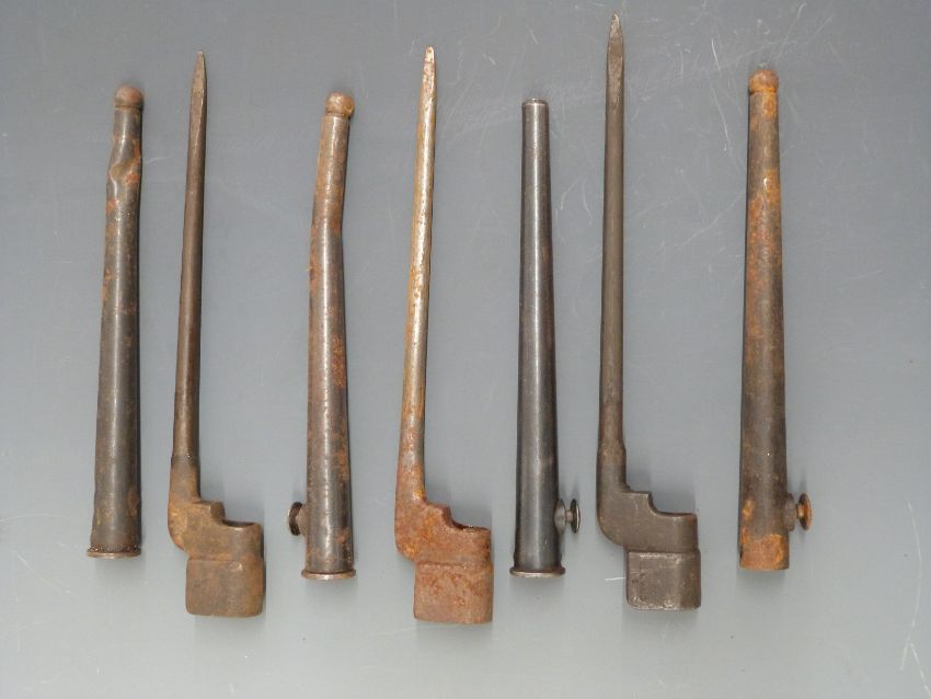 British Army Lee Enfield no4 Mark 3 spike bayonet and scabbard, blade length 20cm together with two other similar examples and another scabbard