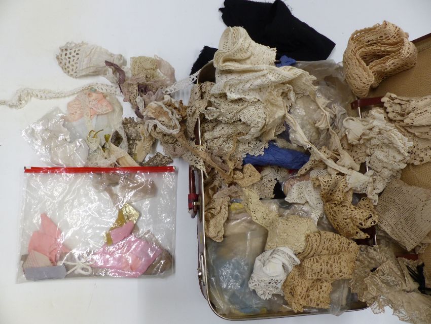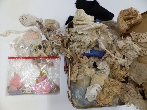 Vintage suitcase of lace trims, collars, doilies etc