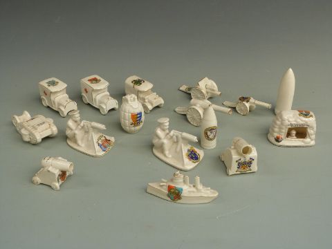 A collection of  WWI related crested ware, examples by Arcadian and Carlton, including Tommy and his machine gun, tank, field guns, ambulances, shells etc, various crests including Edinburgh, Reading, Pontefract, Scarborough, Brighton and Exmoor.