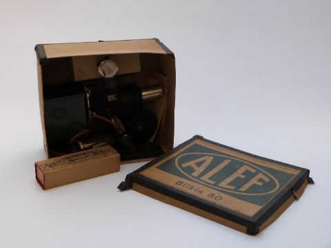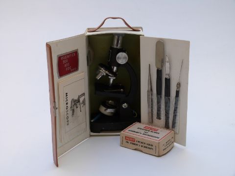 Five vintage childrens toys and games including Merit Microscope with specimen slides, Vulcan Senior sewing machine, ALEF projector etc, all in original boxes
