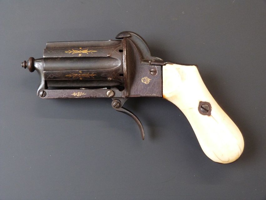 Unnamed 7mm six-shot pinfire hammer action pepperbox revolver with shaped ivory grips, folding trigger, all over silver wire and gold inlay and 2 inch barrels, overall length 15cm.