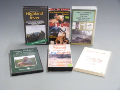 Six shooting related DVD's and videos Game-To-Eat Cooking with Game, Siberian Buck and Black Grouse, Highland Fever, Gralloching & Lardering For The Deer Stalking Certificate, Safari on the Savuti and Mark Sullivan Presents Shot To Death.