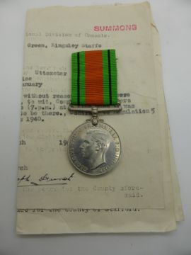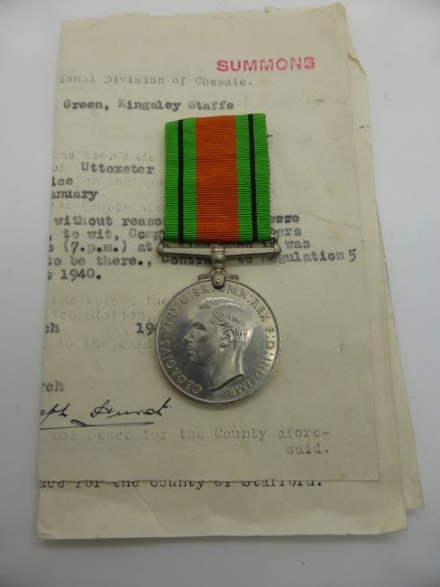 British Army WWII medals comprising 1939/45 Star, France and Germany Star, War Medal and Defence Medal together with a further Defence Medal and summons dated 1944 for William Philip Keates for being unlawfully absent from duty