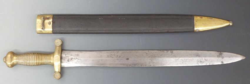 French 1831 pattern' Gladius Briquet' 'short sword in scabbard with indistinct Paris mark. Blade length 48cm.
