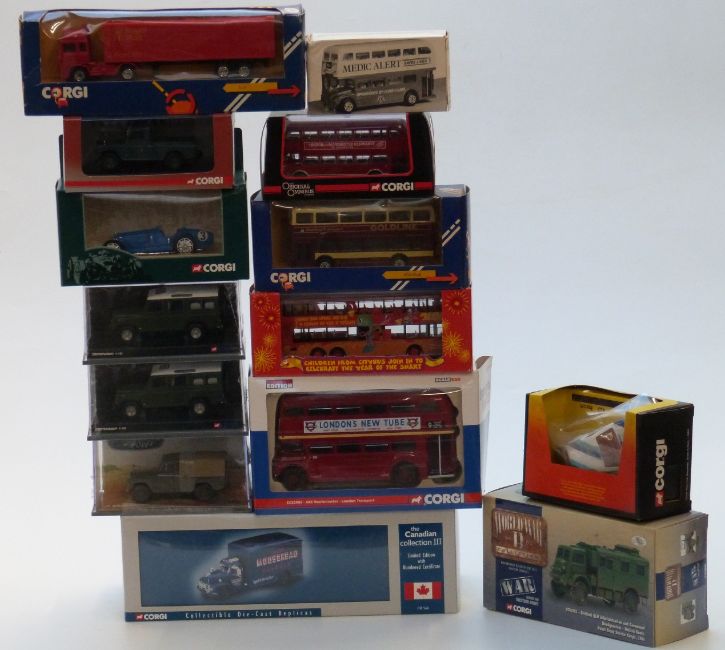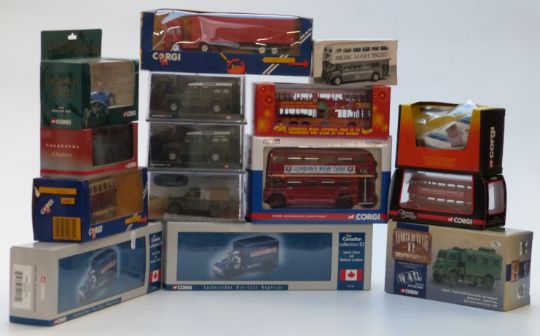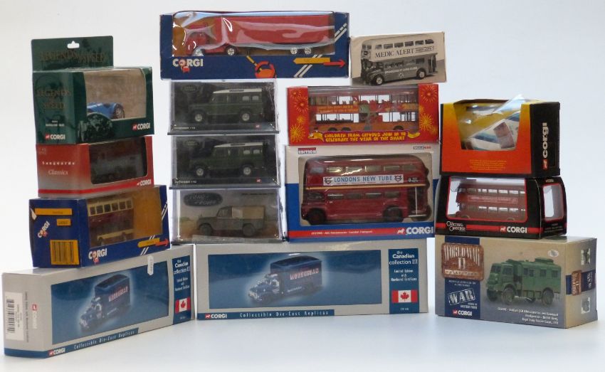 Fifteen Corgi diecast model vehicles including World War II, Legends of Speed, The Canadian Collection III, Vanguards, Original Omnibus Company (OOC), Buses in Britain etc, some limited edition, all in original boxes