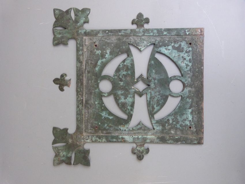 Arts and Crafts pierced copper plaque with fleur de lys decoration, height 32cm