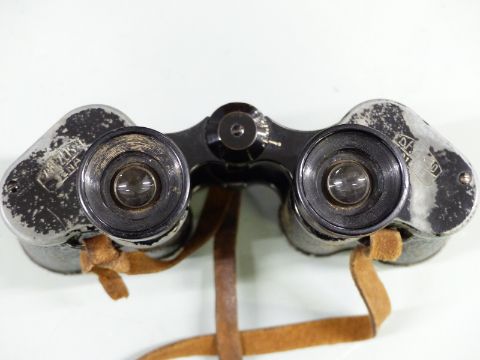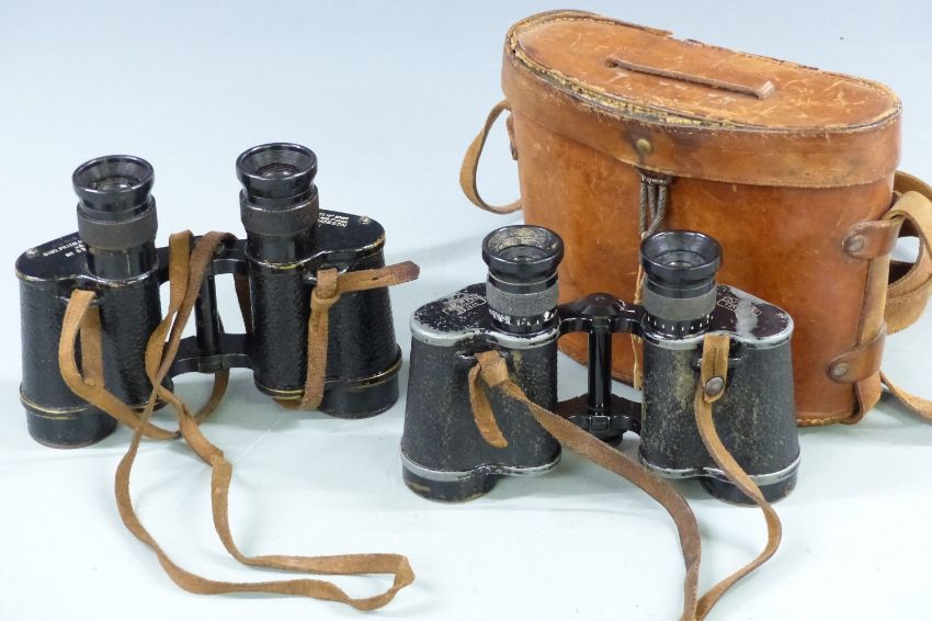 Two pairs of British Army WWII field glasses/ binoculars Taylor-Hobson Bino Prism No.2 Mk.II No.53452 and Carl Zeiss Jena D.F. 6x30 in original leather carry case.