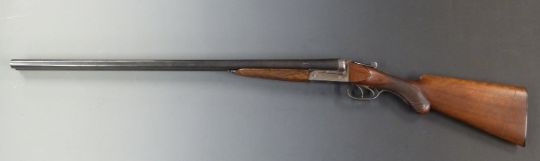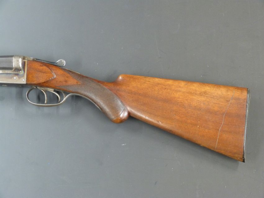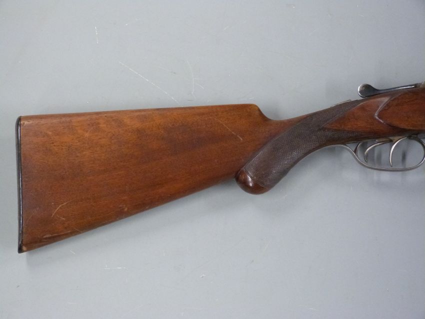 Foreign 12 bore side by side shotgun with engraved lock, top plate and thumb lever, chequered semi-pistol grip and barrels, double trigger and 28 inch barrels, overall length 112cm, length of pull 35.5cm, serial number 41526. PLEASE NOTE THAT A VALID RELEVANT FIREARMS/SHOTGUN CERTIFICATE IS REQUIRED TO HANDLE/PURCHASE THIS ITEM.