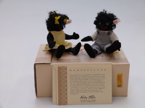 Two Steiff Teddy bears Golly Kids with black felt bodies, striped clothes and jointed limbs, limited edition 467/1500, each 16cm tall, in original box with certificate