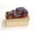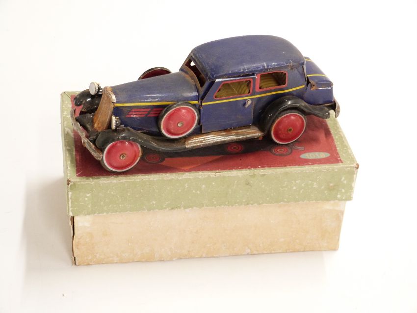 Supertoys clockwork tinplate car with blue body, red and yellow decoration, red hubs and opening boot and doors, 1018, in original box.