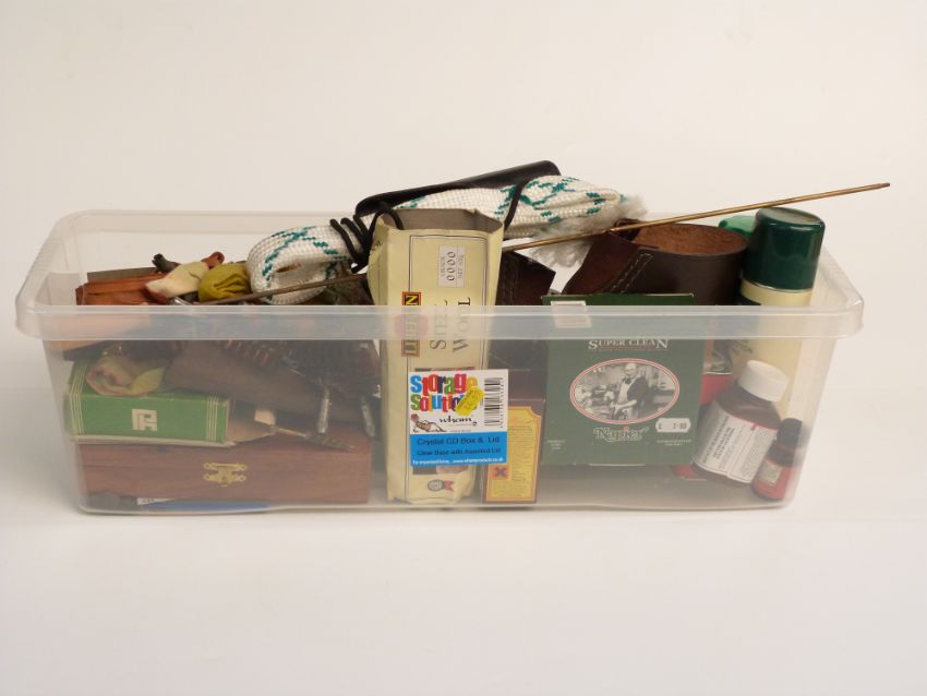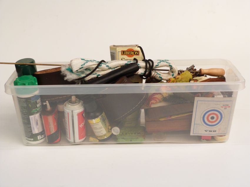 A collection of gun cleaning kit and accessories including butt pads, a cased set of tools,forend covers oils etc.
