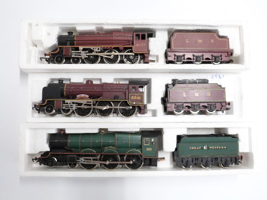 Three Hornby 00 gauge LMS 4-6-0 locomotives Patriot Class 5XP Duke of Sutherland R357 Class 5 4657 R842 and King Class King Edward I R078, all in original boxes