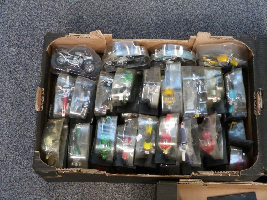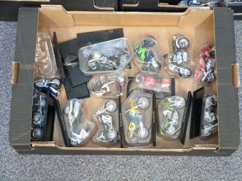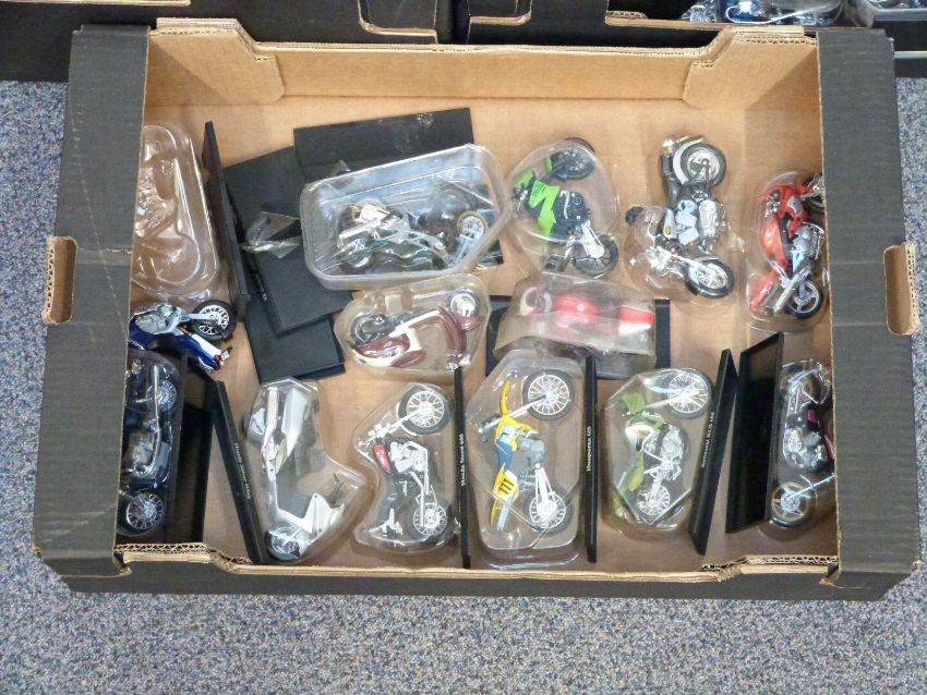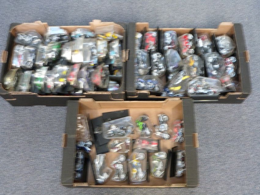 Eighty-nine Maisto 1:18 scale diecast model motorbikes, all in original packaging and on named plinths