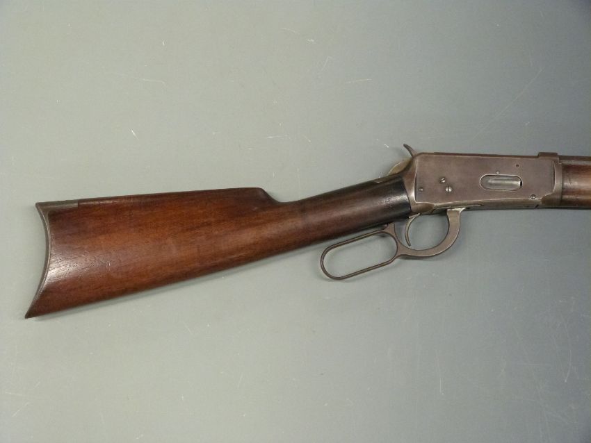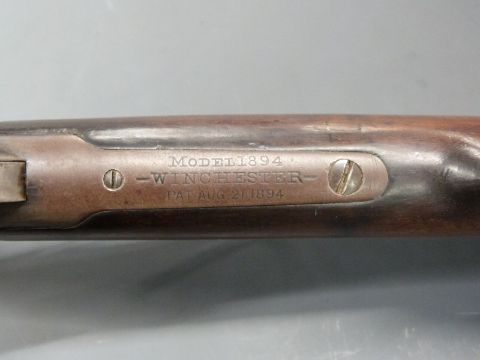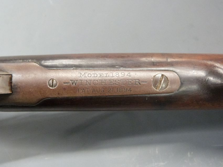Winchester Model 1894 .32-40 underlever repeating rifle with adjustable sights, steel butt plate and mounts, walnut stock, top plate stamped 'Winchester Model 1894 PAT AUG 21 1894' and 26 inch barrel stamped 'Manufactued By The Winchester Repeating Arms Co. New Haven, Conn. U.S.A.', overall length 113cm, serial number 144504.