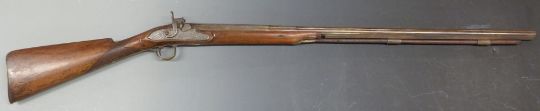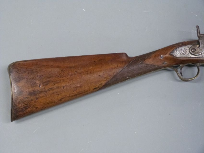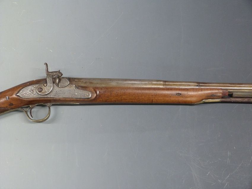 Percussion hammer action gun with engraved lock, trigger guard, top plate and brass pineapple finialled trigger guard, chequered grip, wooden ram-rod, brass butt plate and mounts and 32 inch multi-stage barrel, overall length 124cm.