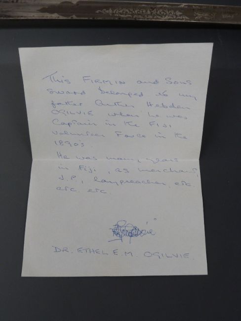 An 1897 pattern British Infantry officer's sword in scabbard by Firmin and Son, with letter of provenance stating that the sword once belonged to Arthur Hebden Ogilvie who was a captain in the Fiji Volunteer Force c1890's