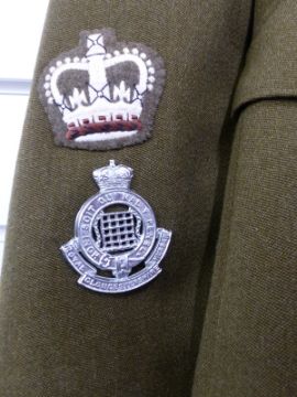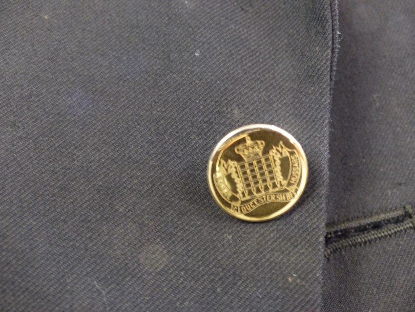 British Army No 2 dress jacket and trousers uniform jacket with Royal Gloucestershire Hussars buttons, collar badges and brass shoulder titles (RGH) together with a pair of barrack trousers. A pair of Blues trousers and a blazer, all large