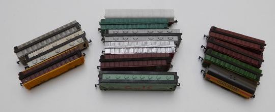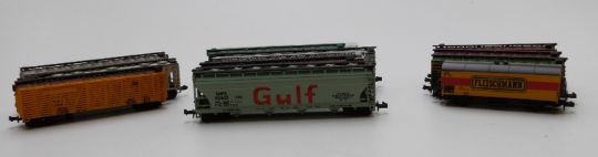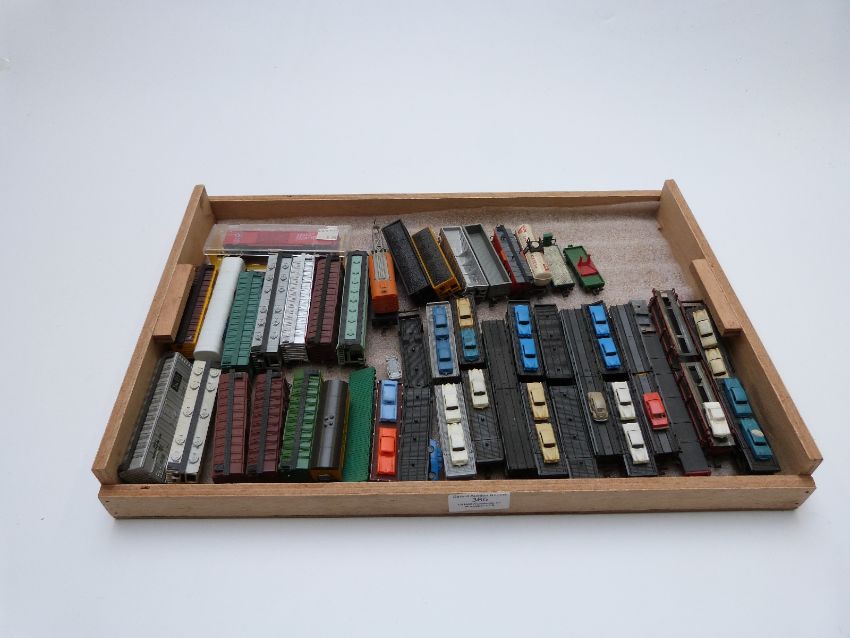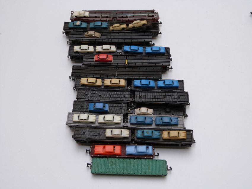 Thirty-seven Fleischmann, Lima and similar N gauge wagons, car transporters, cranes etc, one in original box