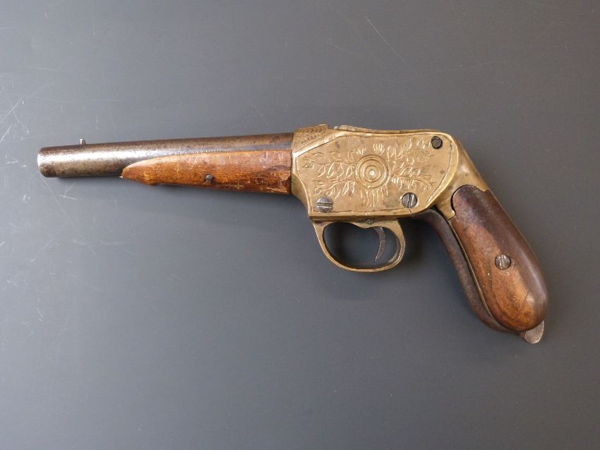 11mm brass framed Martini action pistol with deeply engraved frame, shaped underlever, grips and forend, brass trigger guard and 5.5 inch barrel, overall length 28cm.